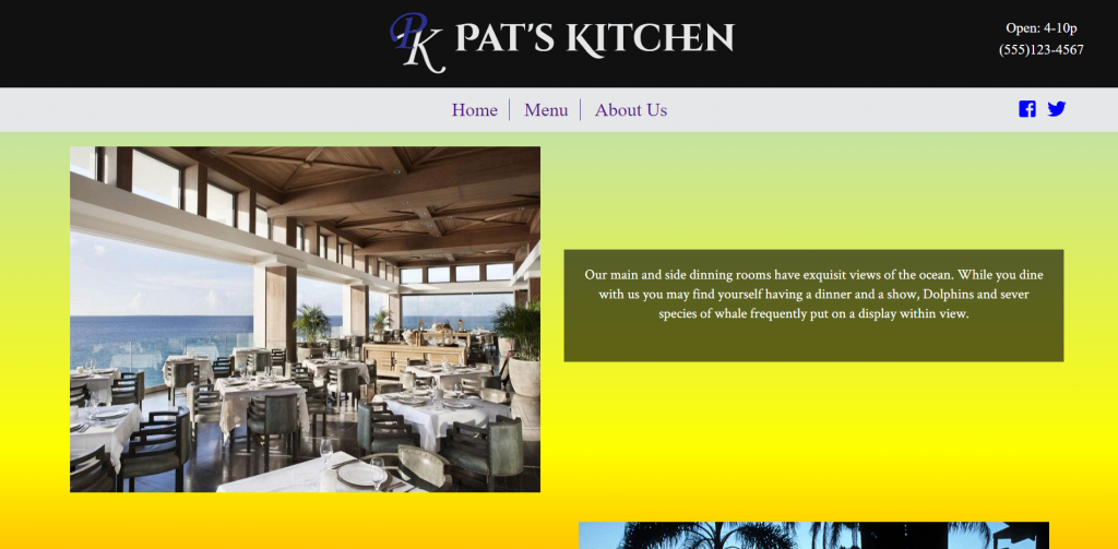 Pat’s Kitchen is a concept website for a client’s restaurant on the gulf. He requested a grab your attention site that was easy to navigate and needed a sunset color scheme.